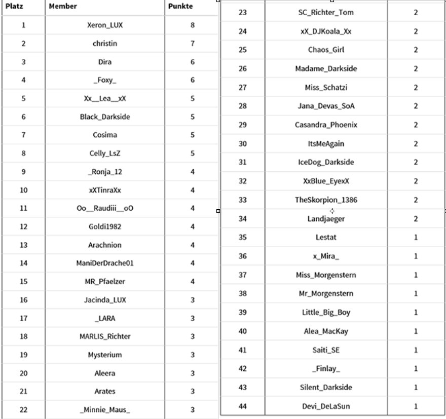 1 Platz: Amika92, misdarkshadow79, Freche_Zicke